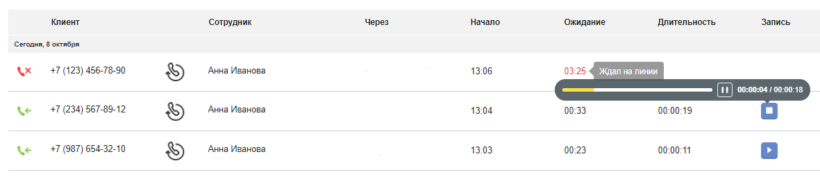 Кроме того, в истории можно прослушать записи звонков, заказанных через виджет обратного звонка с сайта.