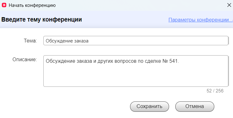 • либо кликните на фразу «Параметры конференции», в этом случае появится два дополнительных поля, в которых можно не только назвать событие, но и добавить описание.