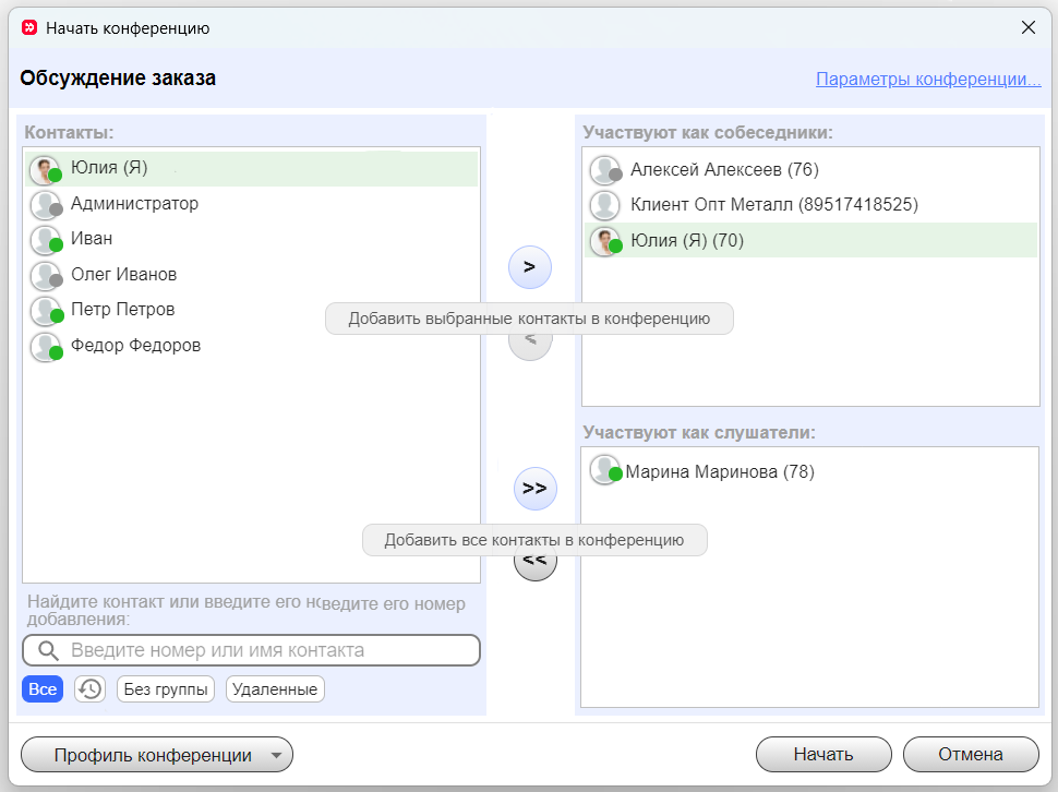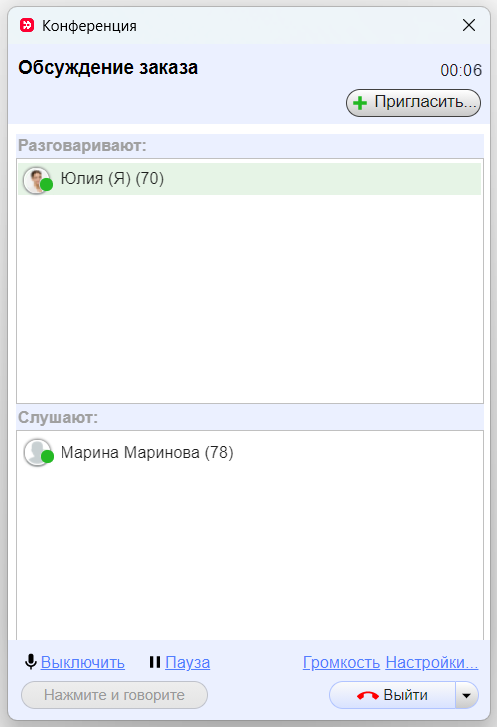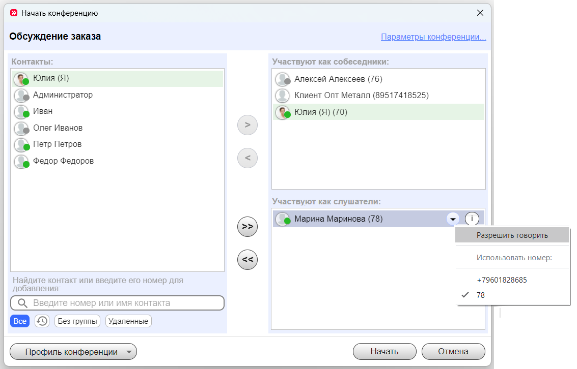 Начнется вызов участников конференции. Вы будете видеть, кто вошел или еще не вошел в конференцию. Напротив каждого участника вы можете указать, может ли он разговаривать во время конференции или вообще отключить.