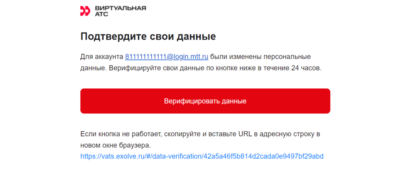 Обратите внимание: если вы не подтвердите контактные данные в течении 24 часов, то не сможете авторизоваться в ВАТС и восстановить пароль. Тогда вам нужно будет обратиться в поддержку для восстановления данных. После чего вам будет повторно отправлена новая ссылка для подтверждения данных на почту.