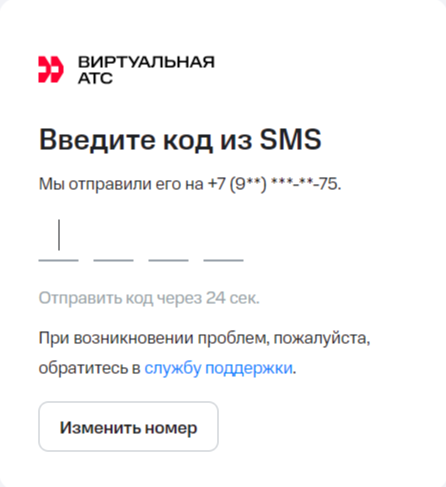 2. После этого откроется окно подтверждения личного номера. ВАТС отправит SMS с кодом на указанный номер телефона.