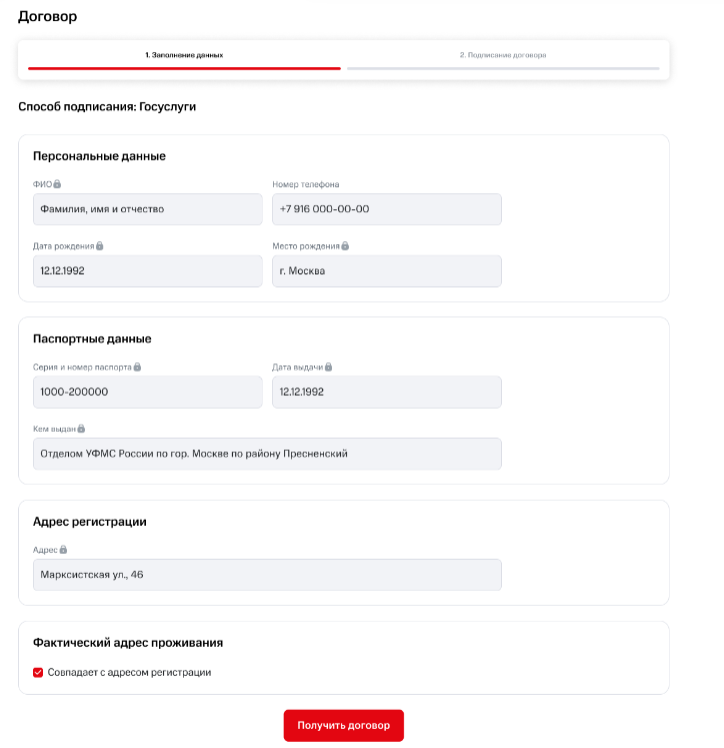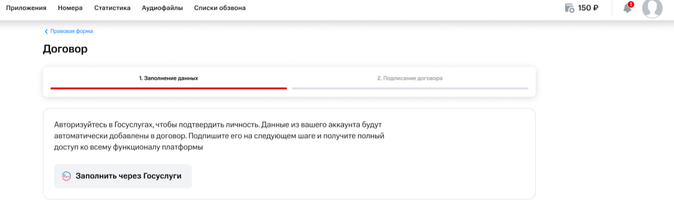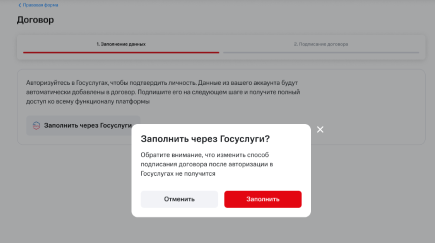 Авторизуйтесь в Госуслугах, чтобы подтвердить личность. Данные из вашего аккаунта будут автоматически добавлены в договор. Подпишите его на следующем шаге и получите полный доступ ко всему функционалу платформы.