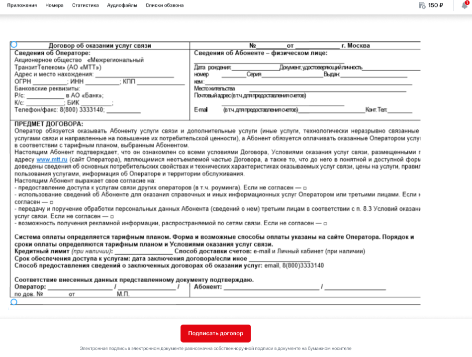 Шаг 3. Менеджер МТС Exolve проверит данные, сформирует договор и свяжется с вами для его подписания. После этого вы сможете распечатать и подписать документ.