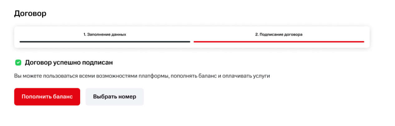 6. После этого вы увидите сообщение, что договор успешно подписан, и сможете пополнить баланс либо перейти к выбору номера.