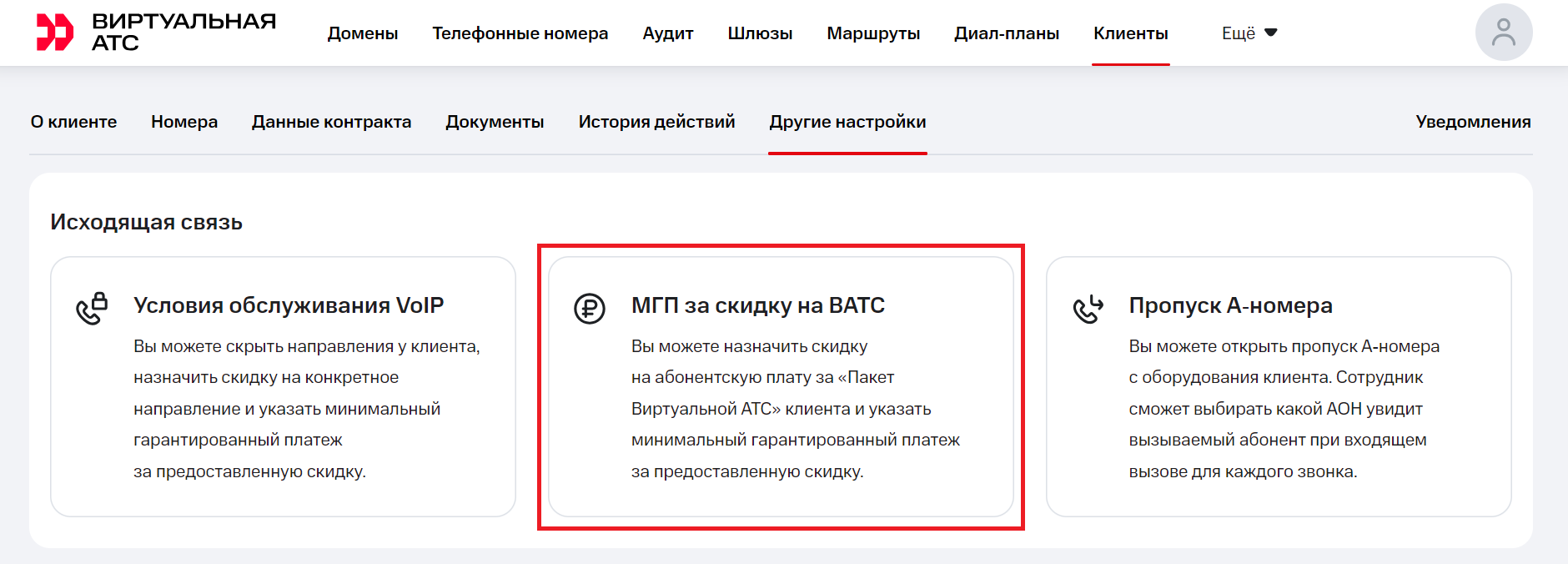 1. Перейдите в раздел «Другие настройки» – «МГП за скидку на ВАТС», чтобы назначить минимальный гарантированный платеж (МГП) за предлагаемую скидку.