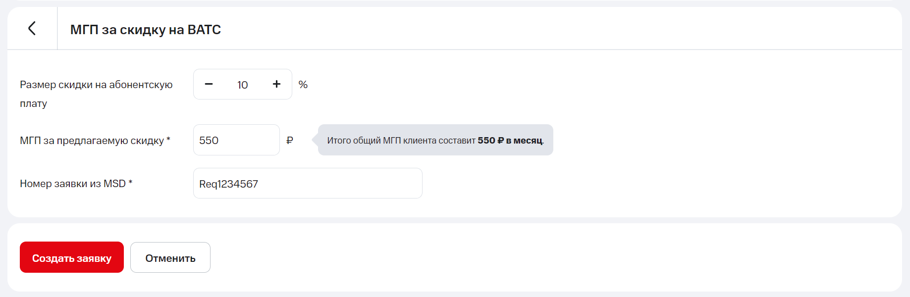 Чтобы поощрить или удержать клиента, менеджер может предложить ему скидку на абонентскую плату за тариф «Базовый» в Виртуальной АТС. Чтобы получить скидку, клиенту нужно согласиться на минимальный гарантированный платеж, который менеджер укажет в заявке.