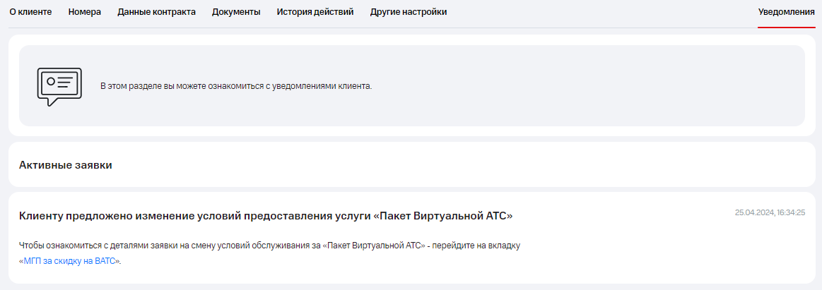 5. Клиент увидит заявку на скидку в разделе «Уведомления» своей Виртуальной АТС. Чтобы узнать о заявке больше, он должен кликнуть на фразу «МГП за скидку на ВАТС».