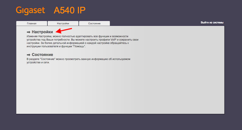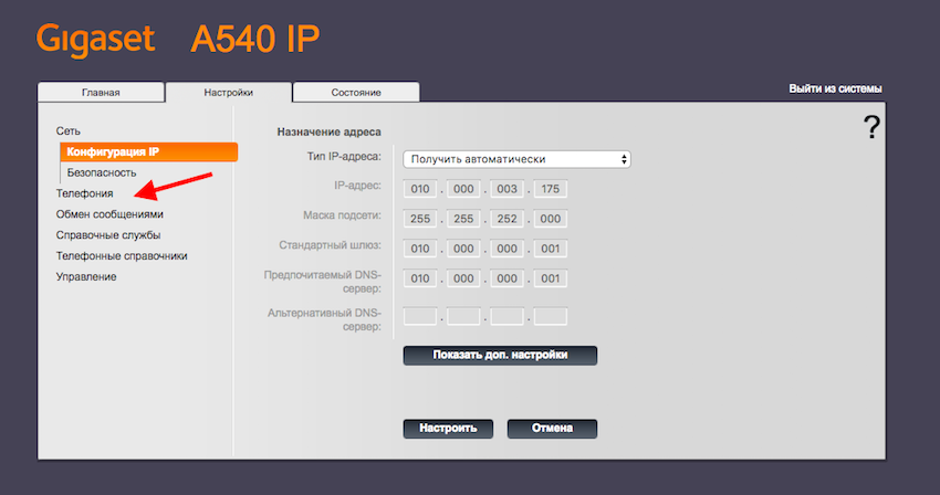 3. На DECT-трубке зайдите в МенюНастройкиСистема и запишите IP-адрес (вида 192.168.0.76).