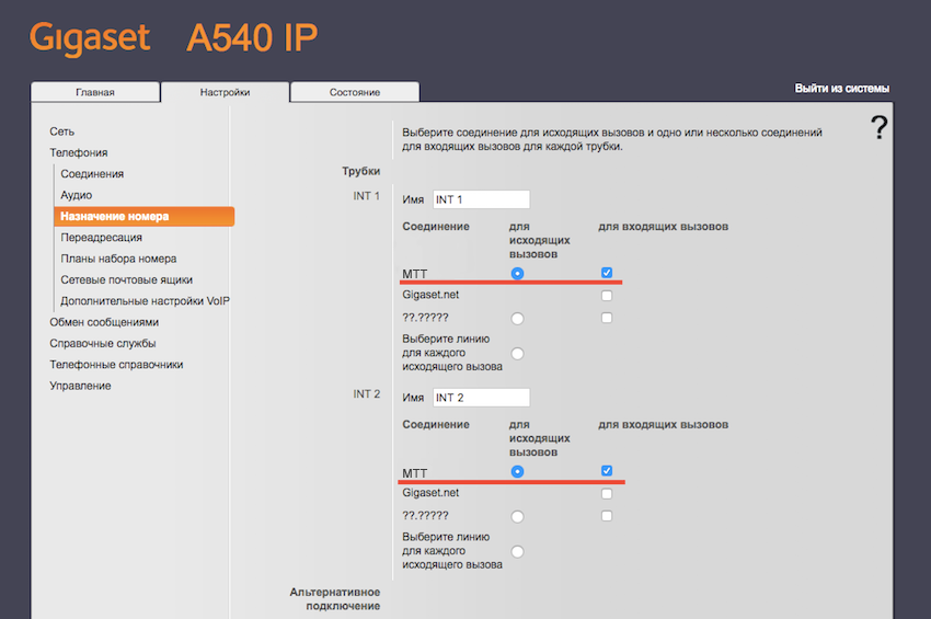 И для первой, и для второй трубки выберите настроенный аккаунт и для исходящих, и для исходящих вызовов, напротив других соединений галочки уберите.