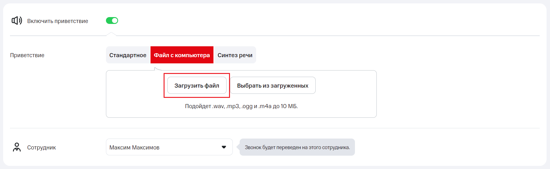1. В настройках приветствия перейдите на вкладку «Файл с компьютера» и нажмите на кнопку «Загрузить файл».