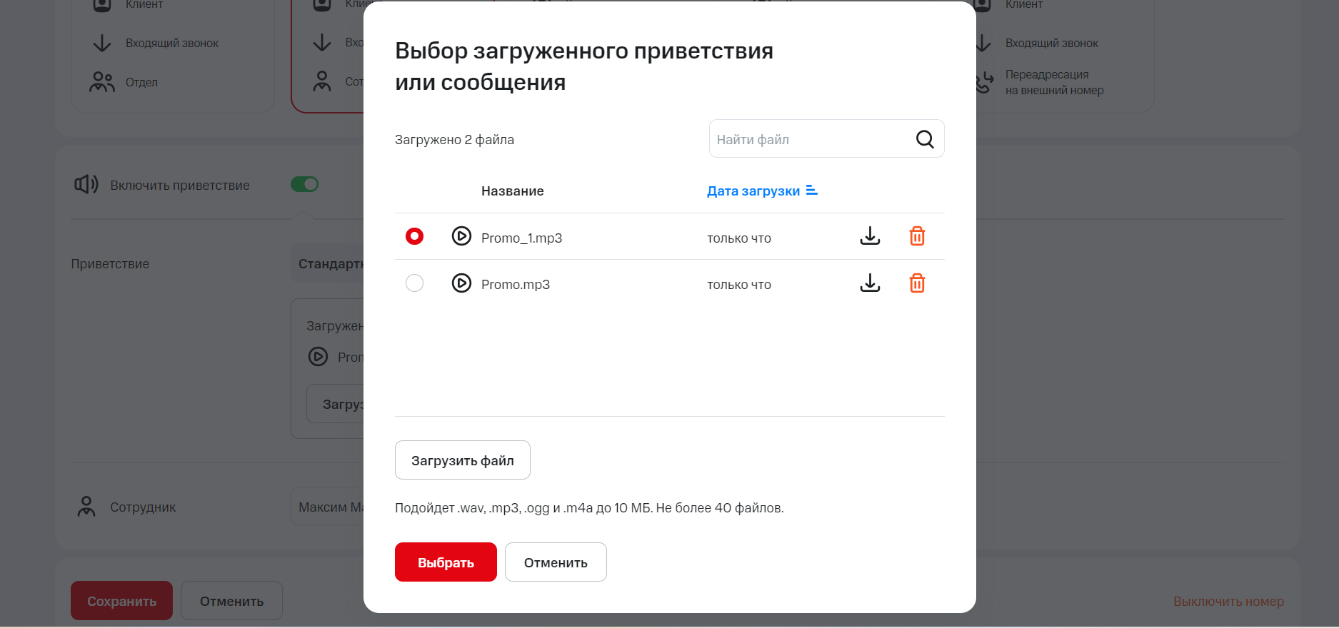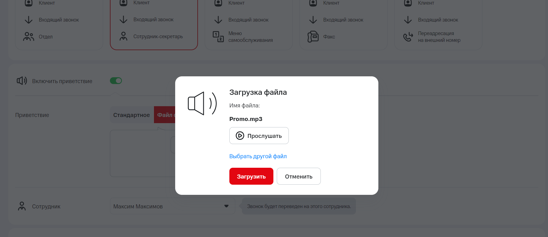 Рассмотрим, как загрузить файл в каталог собственных сообщений на примере добавления своего приветствия на номерах. Аналогичным образом можно загрузить свой файл в любом из перечисленных выше разделов.