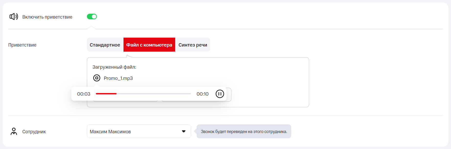 4. Теперь в настройках конкретного номера в разделе «Приветствие» вы сможете увидеть, какое приветствие будет звучать для ваших клиентов, позвонивших на этот номер.