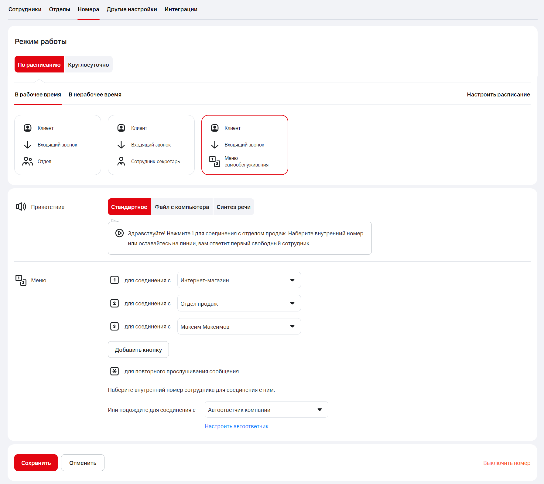 Голосовое меню настраивается отдельно для каждого номера. Перейдите в раздел Номера и выберите номер, на котором хотите настроить голосовое меню. Затем выберите режим работы номера и направьте входящие звонки на «Меню самообслуживания».