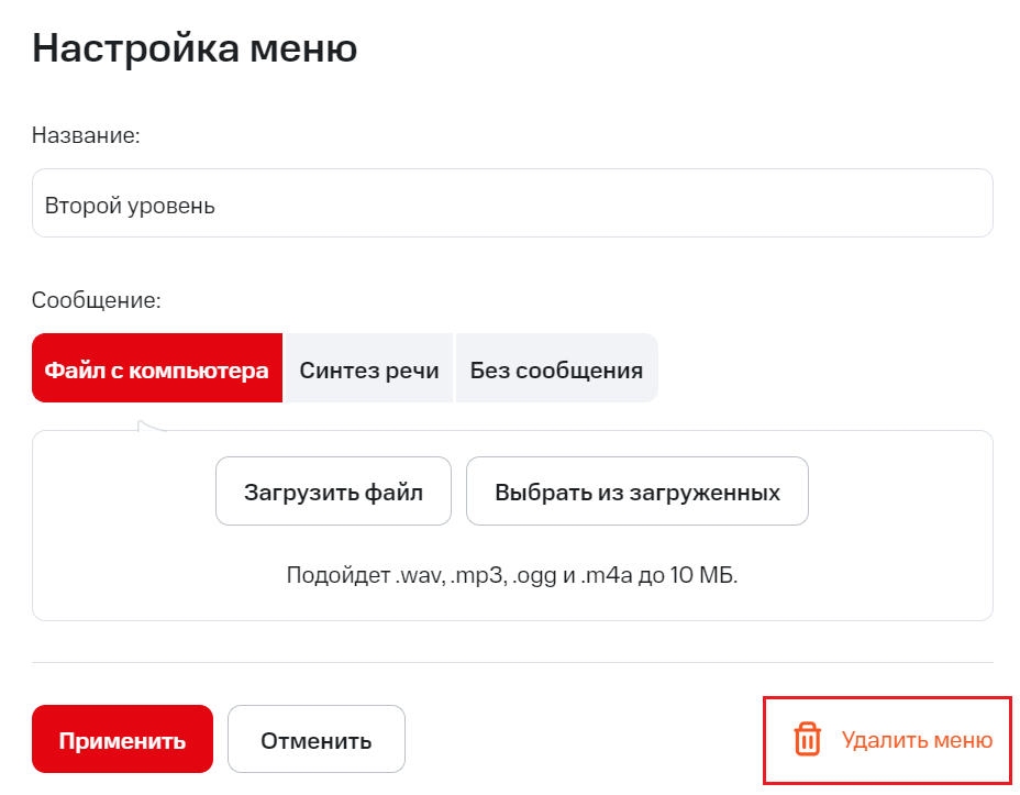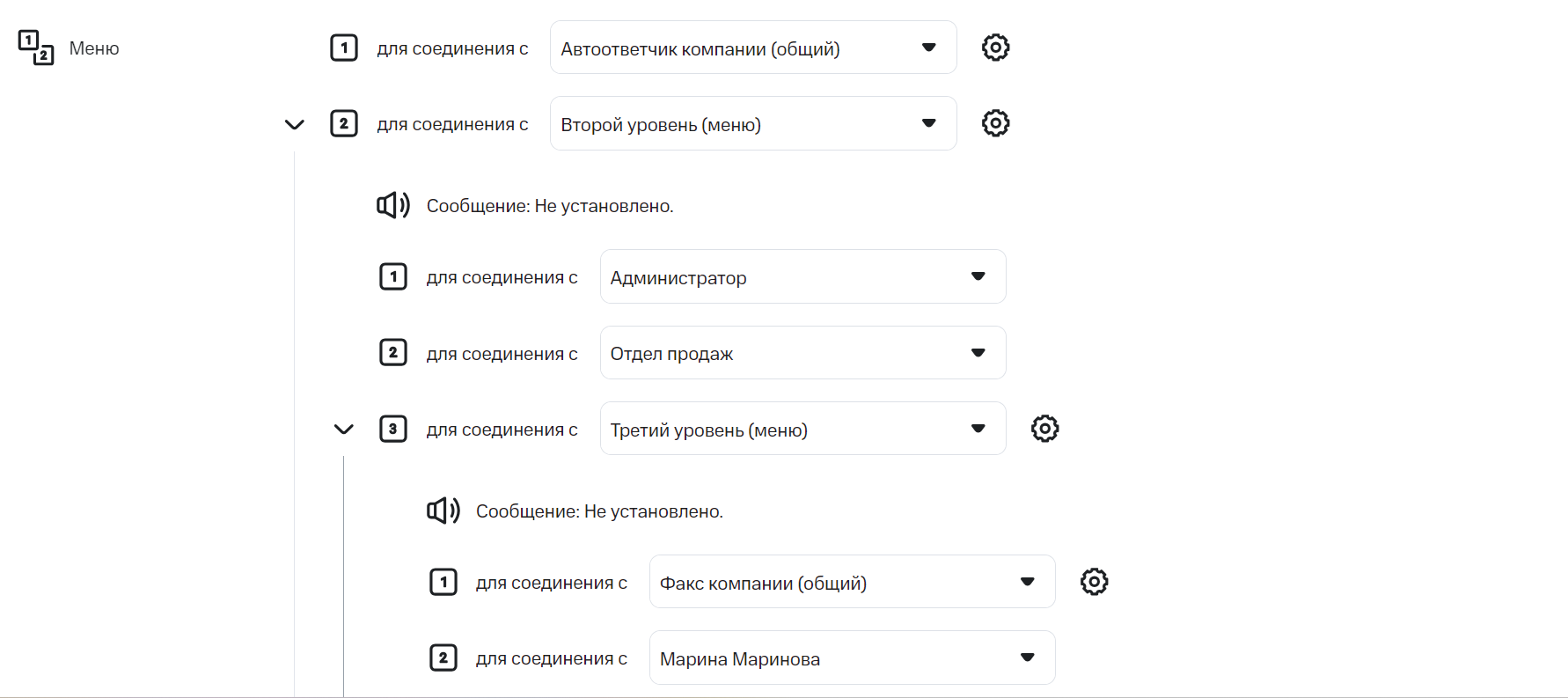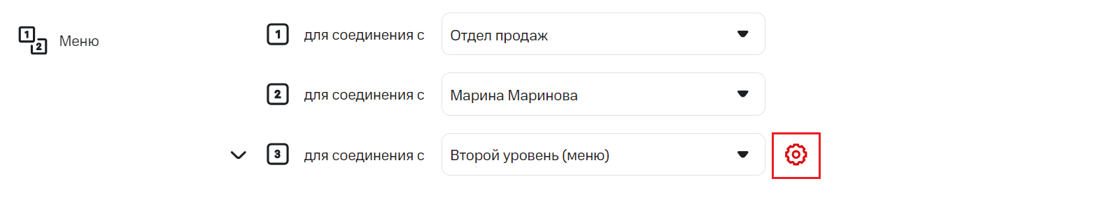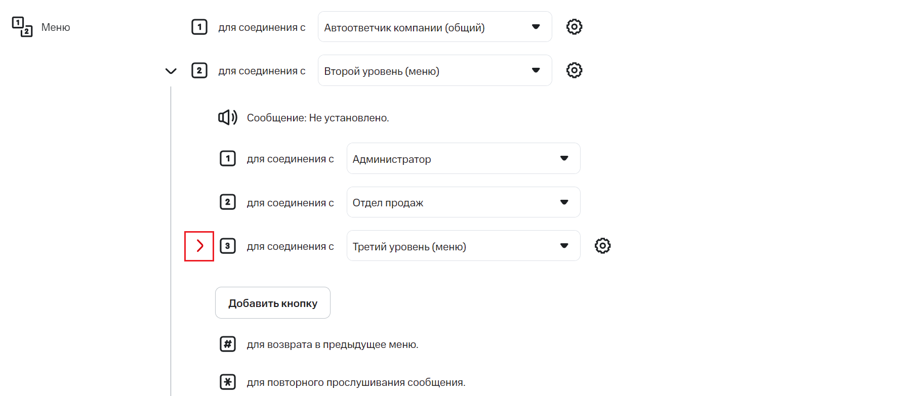 Когда вы снова выберете в раскрывающемся списке, например, «Третий уровень», то откроются все настройки этого уровня — голосовое приветствие, распределение кнопок и вложенные в него уровни.