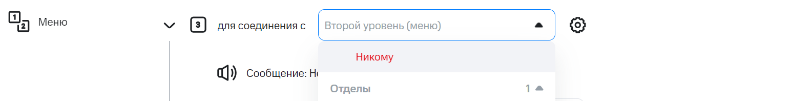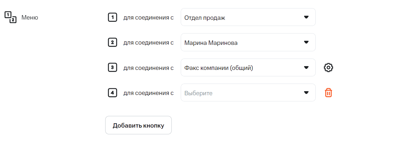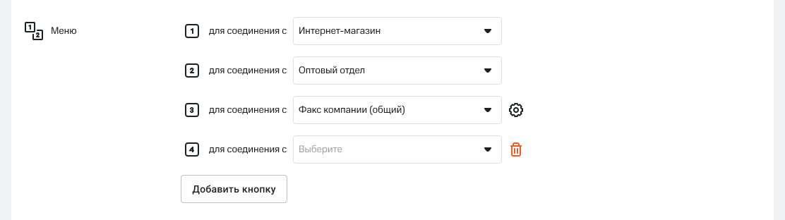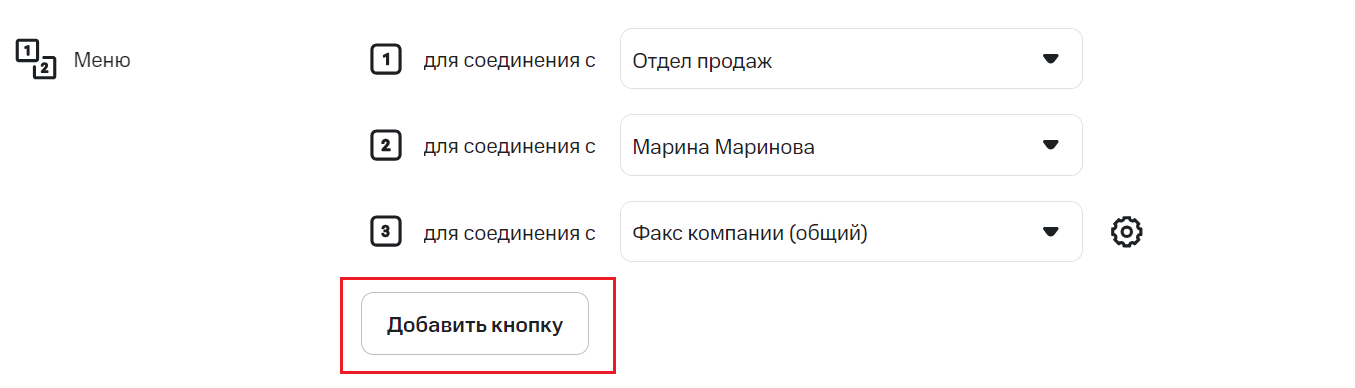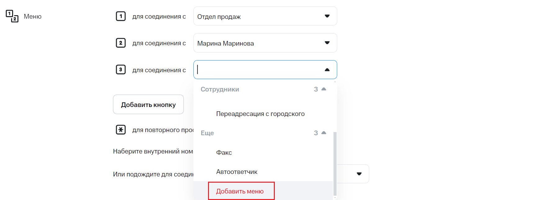 1. Чтобы настроить первый уровень меню, укажите, куда направится вызов при нажатии каждой из кнопок. Так, если вы хотите, чтобы при нажатии кнопки «1» клиенту ответил отдел продаж, откройте раскрывающийся список рядом с текстом «1 для соединения с …» и выберите в нем «Отдел продаж».