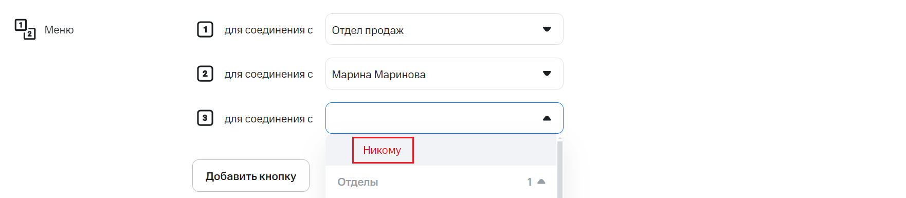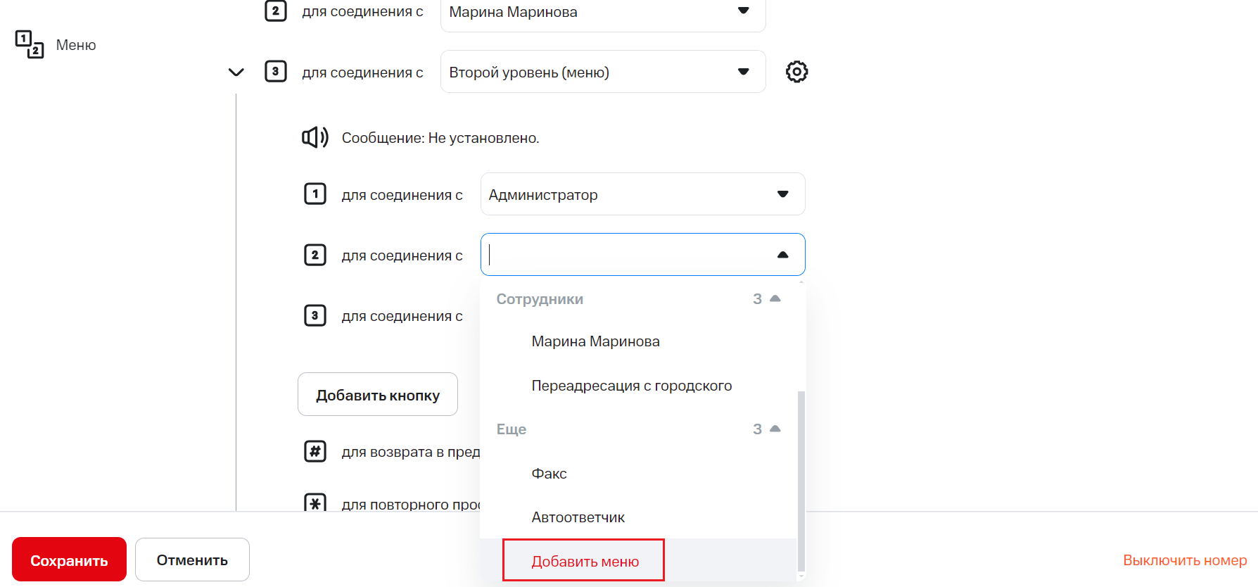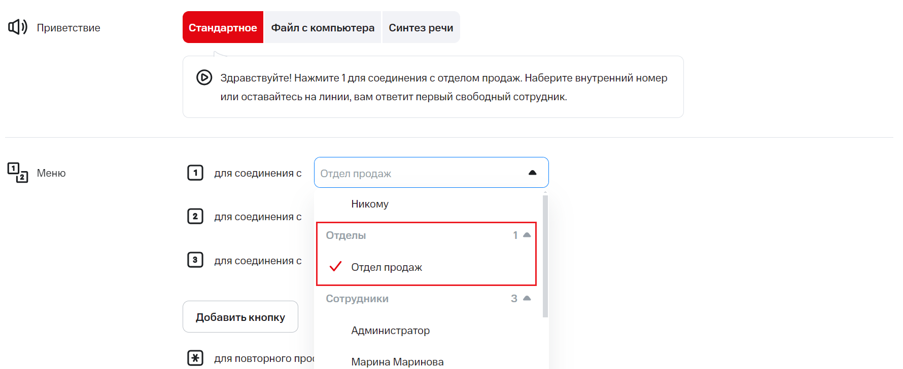 2. Таким же образом выберите, каким отделам или сотрудникам будет поступать звонок при нажатии цифр 2 и 3.