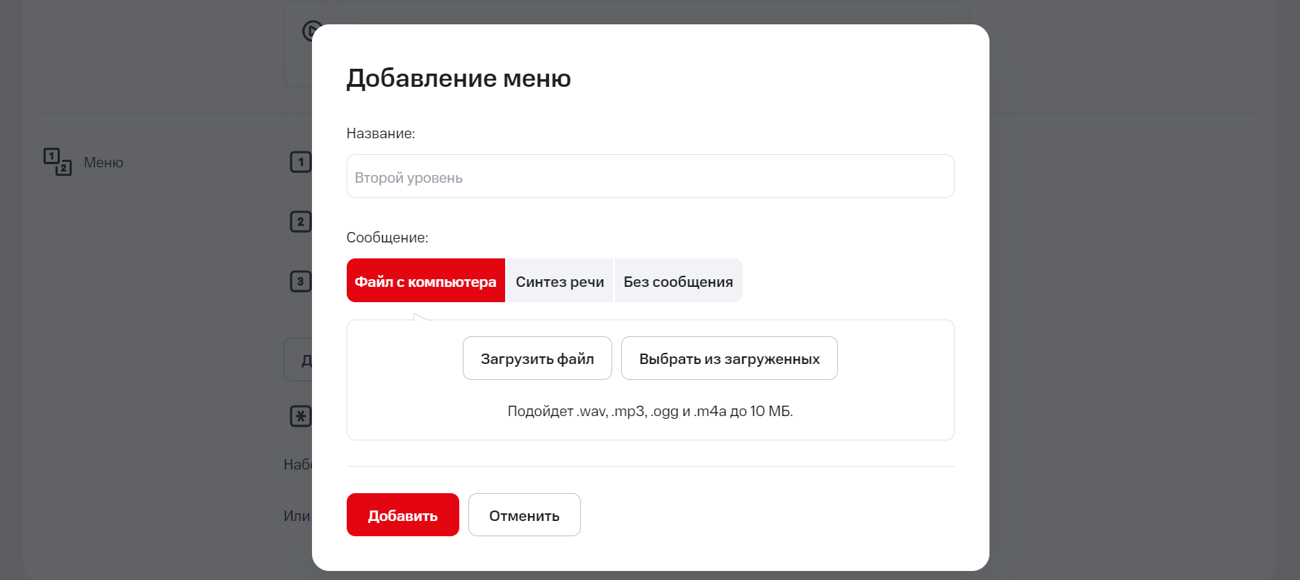 4. Голосовое приветствие настраивается отдельно для каждого уровня меню. Выберите приветствие для второго уровня меню и нажмите «Добавить».