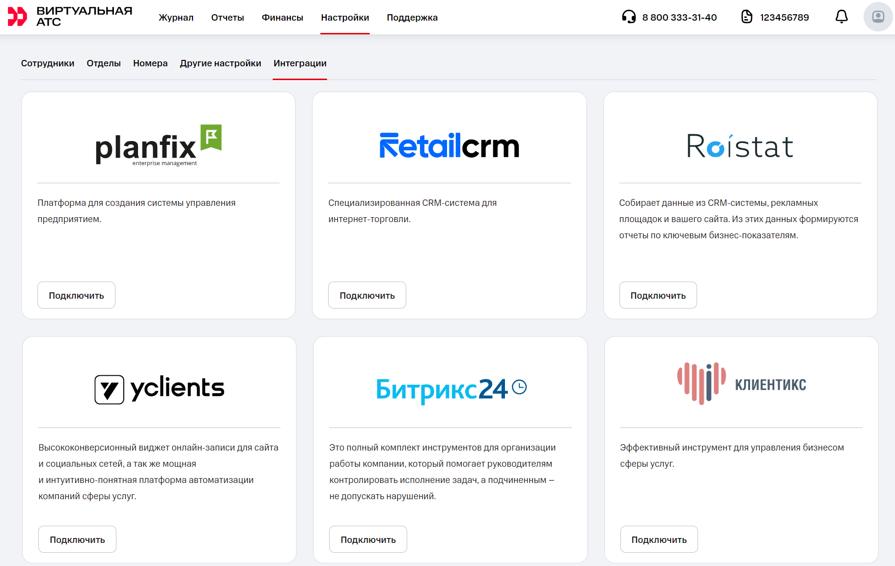 2. В Виртуальной АТС зайдите в «Настройки» – «Интеграции» – «Клиентикс». Нажмите «Подключить».