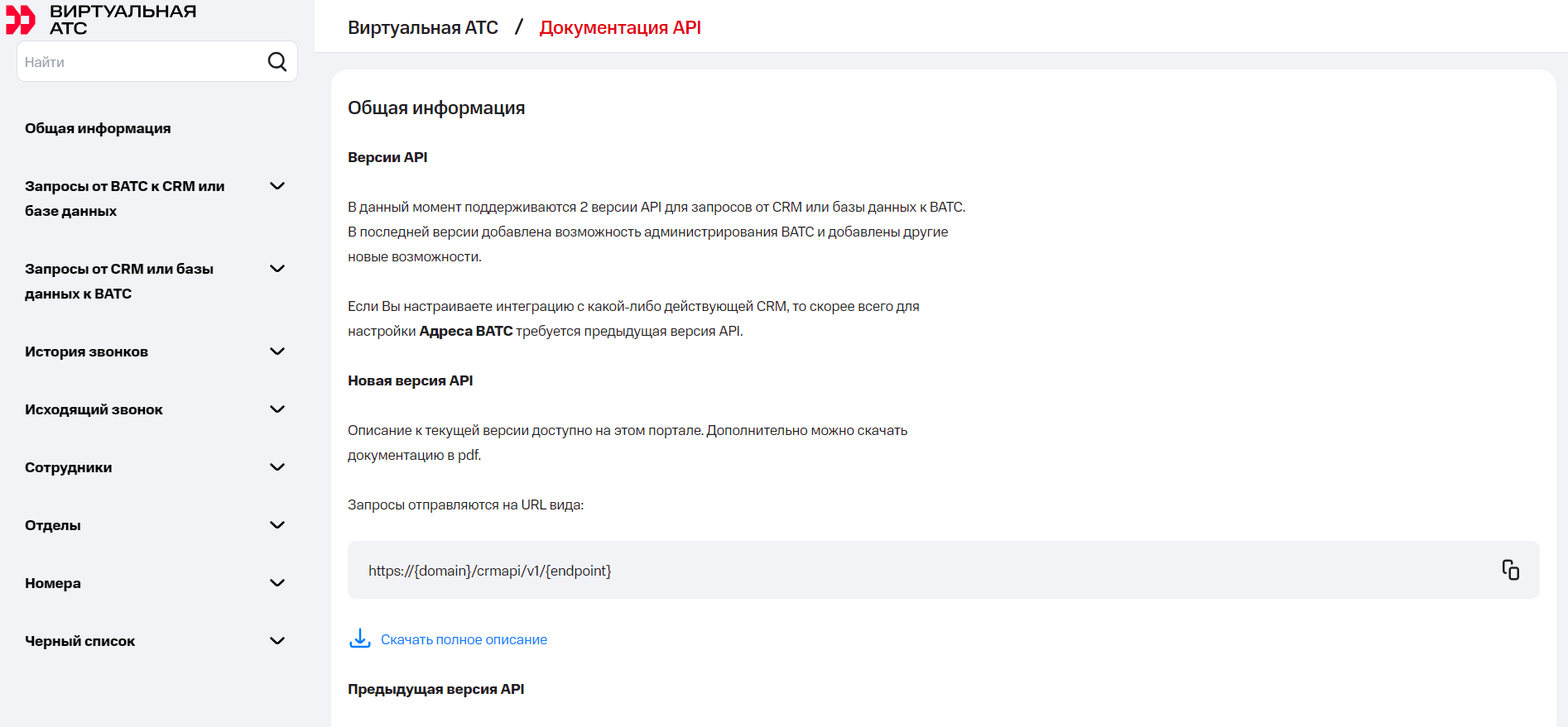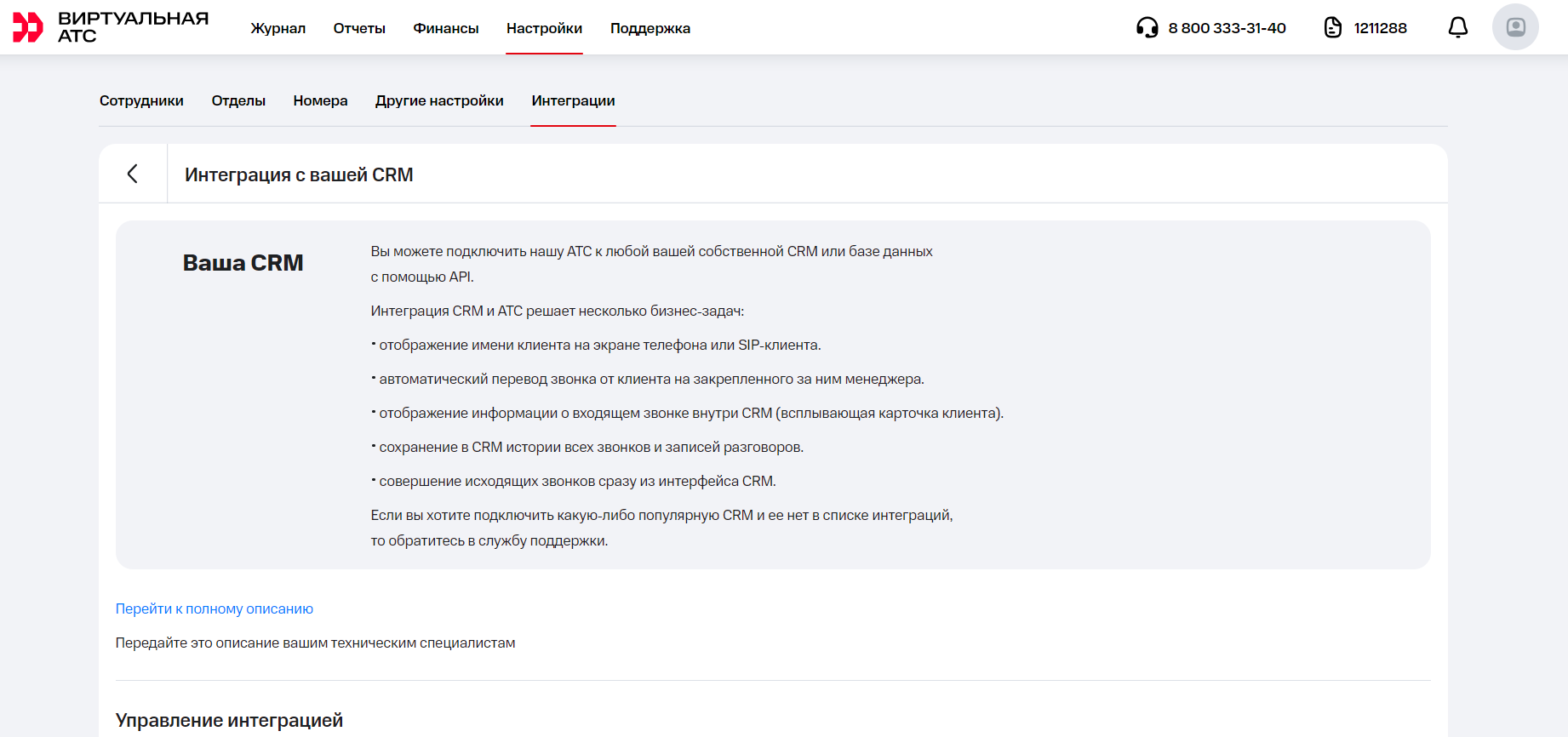 Для доступа к Management API нужно приобрести опцию «Интеграция с CRM», через раздел «Интеграции» личного кабинета ВАТС перейти к настройкам вашей CRM, подключенной по REST API, и кликнуть на ссылку «Перейти к полному описанию».