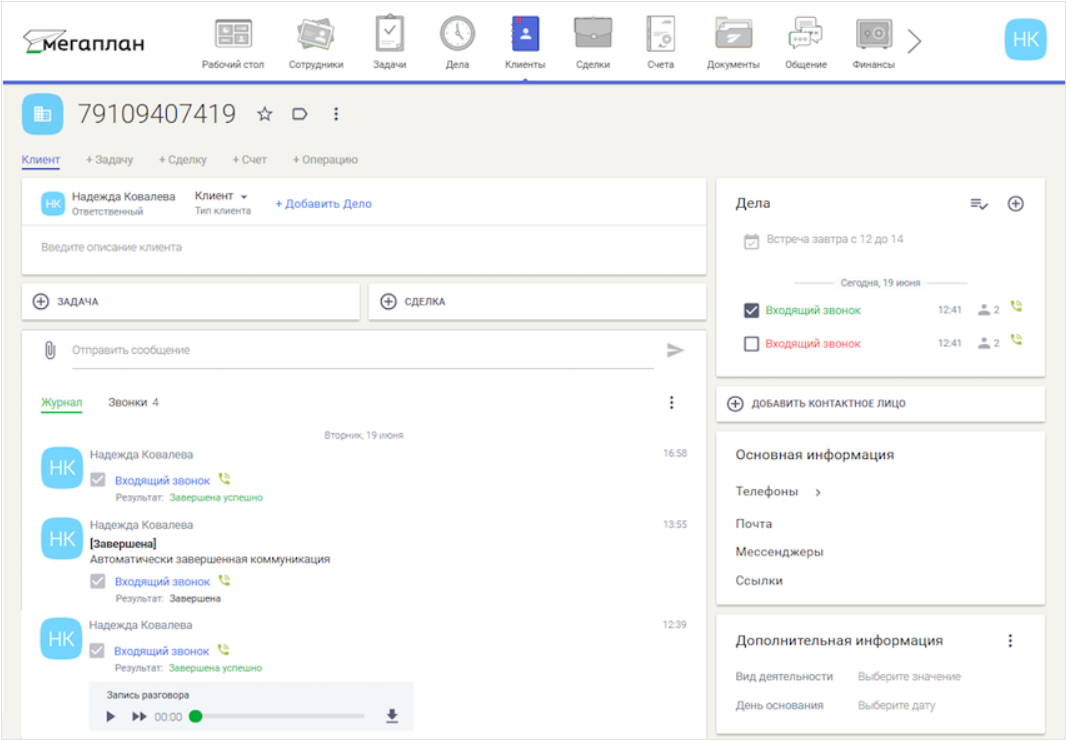 Для исходящего звонка достаточно кликнуть по номеру клиента, находясь в любом разделе CRM-системы.
