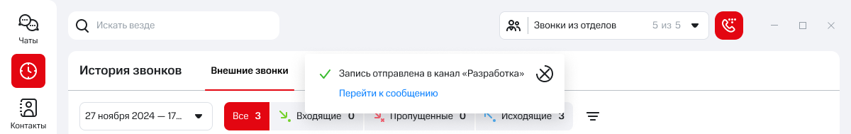 Появится окно с уведомлением об отправке записи. Из него вы можете перейти в чат, куда отправлена запись.