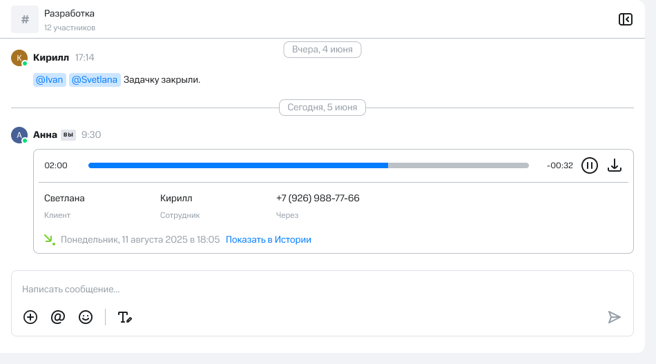 Отправленную запись можно прослушать и скачать прямо в чате.