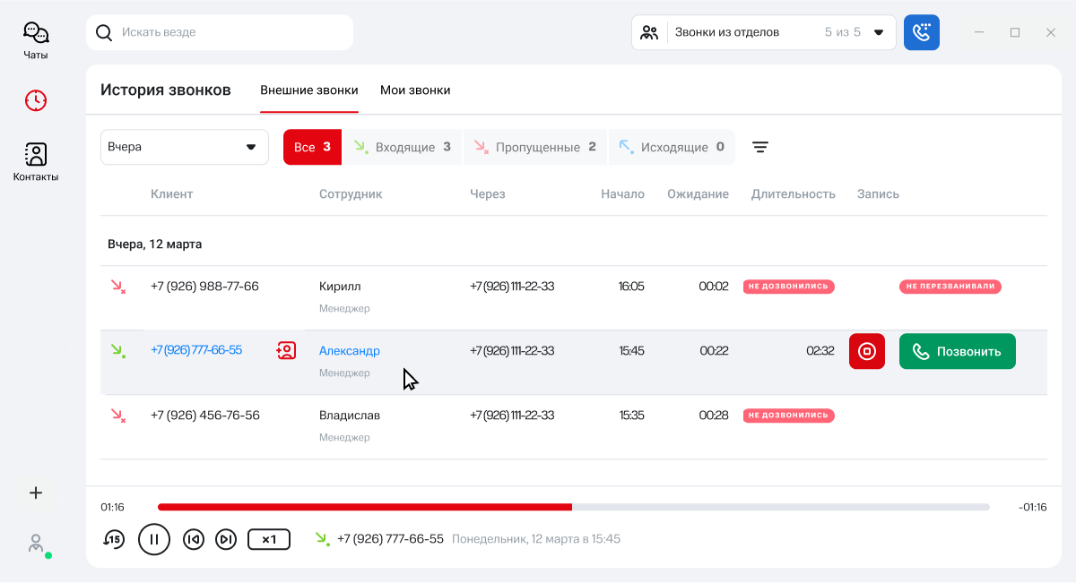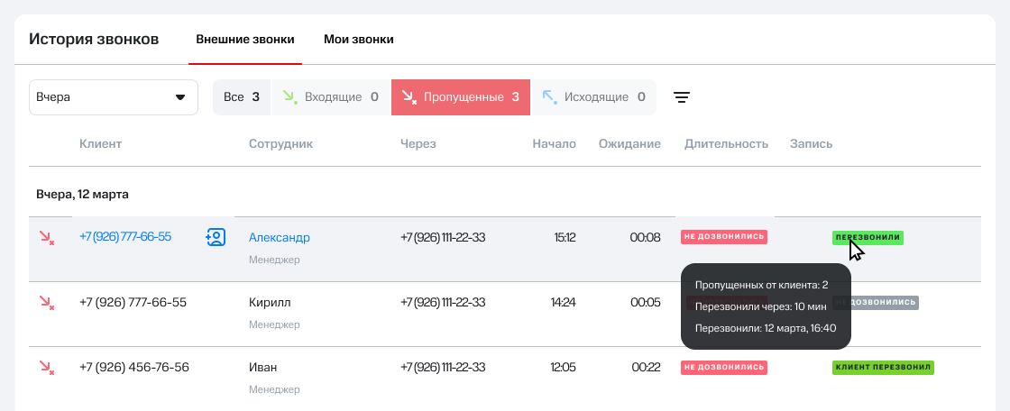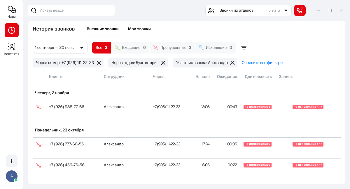 Благодаря фильтру «Контроль пропущенных» вы сможете легко найти непринятые звонки, на которые сотрудники не перезванивали или не дозвонились.