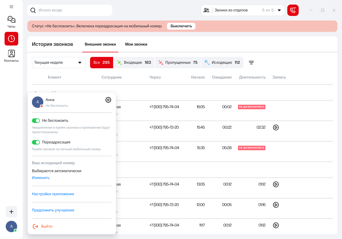 Если при статусе «Не беспокоить» у вас включена переадресация на личный мобильный, то звонки продолжат поступать туда. Выключить переадресацию на личный мобильный можно в том же раскрывающемся списке, что и статус «Не беспокоить».
