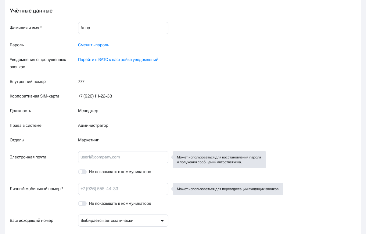 Ниже, в блоке «Учетные данные» можно изменить имя, пароль для входа в АТС, выбрать исходящий номер по умолчанию, добавить личный мобильный для переадресации входящих, а также адрес электронной почты для восстановления пароля и получения сообщений.