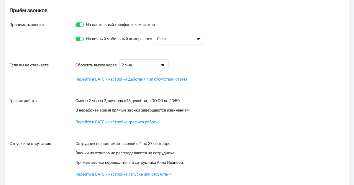 В блоке «Прием звонков» можно изменить настройки: