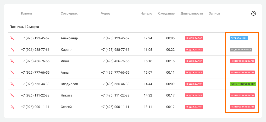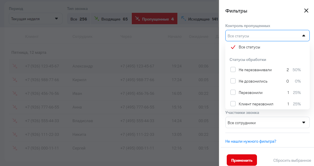 - Контроль пропущенных. Сортируйте непринятые звонки по статусам обработки.
