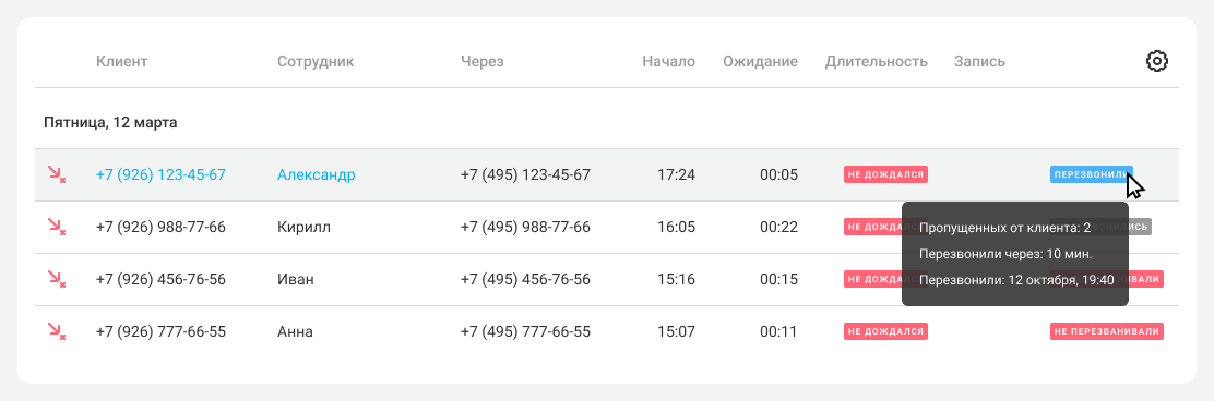 Для руководителя важно понимать, как менеджеры работают с пропущенными звонками – с какого раза удалось перезвонить или клиент так и остался без ответа.