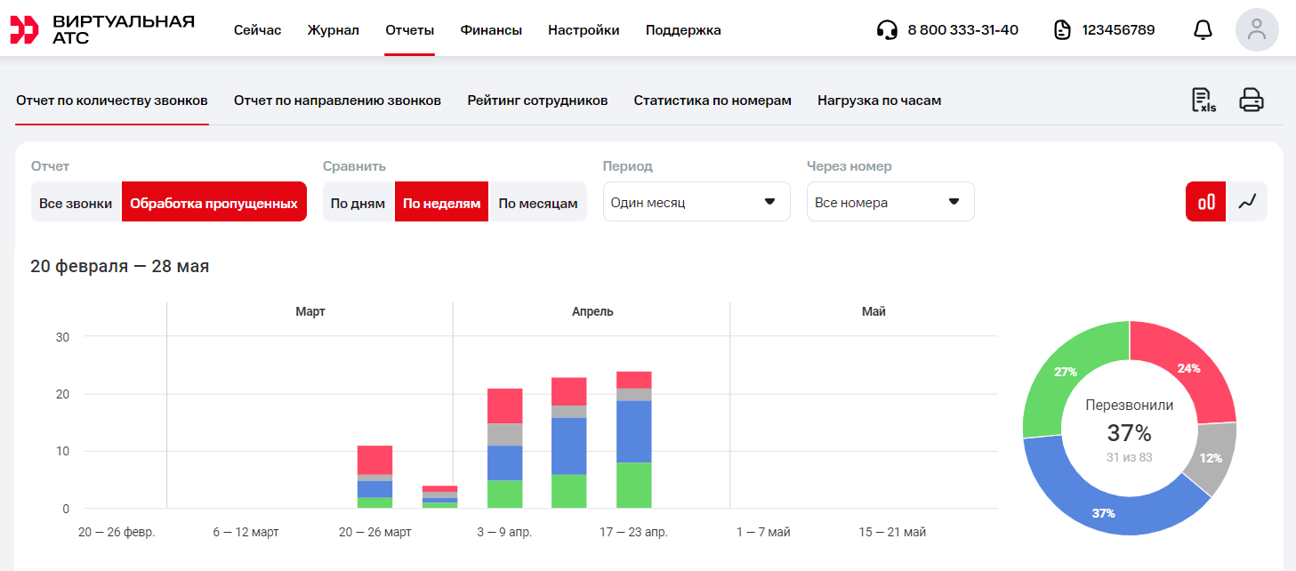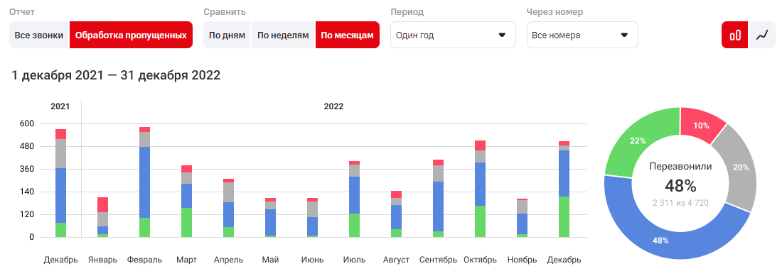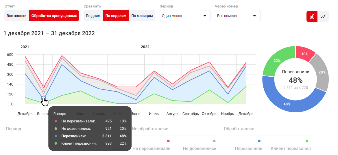 Благодаря визуализации данных, вы сможете оценить, как меняется соотношение обработанных и необработанных пропущенных за выбранный период и организовать активность менеджеров так, чтобы они эффективнее работали во время различных форс-мажоров.