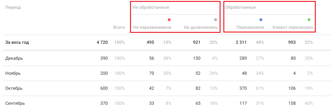 4. Если вы предпочитаете работать с цифрами, используйте данные из таблицы ниже графиков. В ней все пропущенные звонки удобно разнесены по двум столбцам – «Необработанные» и «Обработанные».
