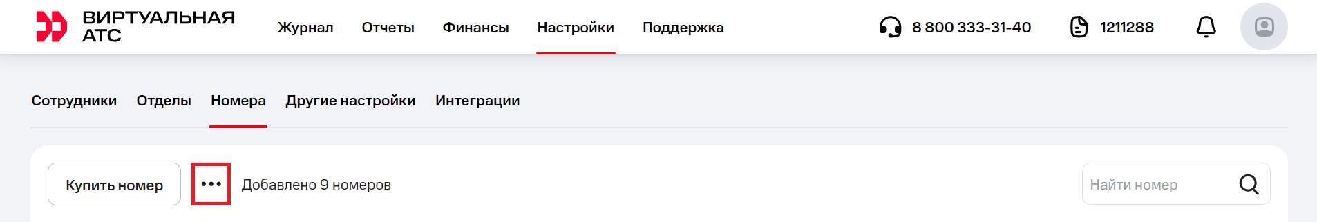 1. Зайдите в раздел «Настройки» на вкладку «Номера». Рядом с кнопкой «Купить номер» нажмите на три точки, чтобы раскрыть меню.