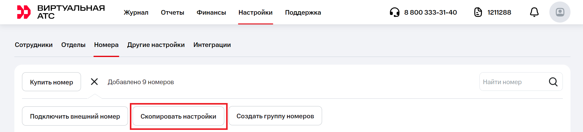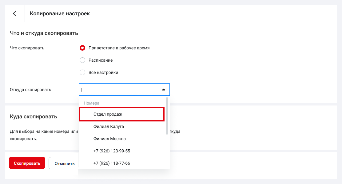 Если у нескольких ваших номеров совпадает только часть настроек (например, приветствие одинаковое для всех номеров, а расписание отличается), вы можете скопировать нужные настройки с одного номера на другие. Это позволяет быстро и гибко настроить 2 и более номеров, но при этом оставляет возможность изменить любой из них в отдельности.