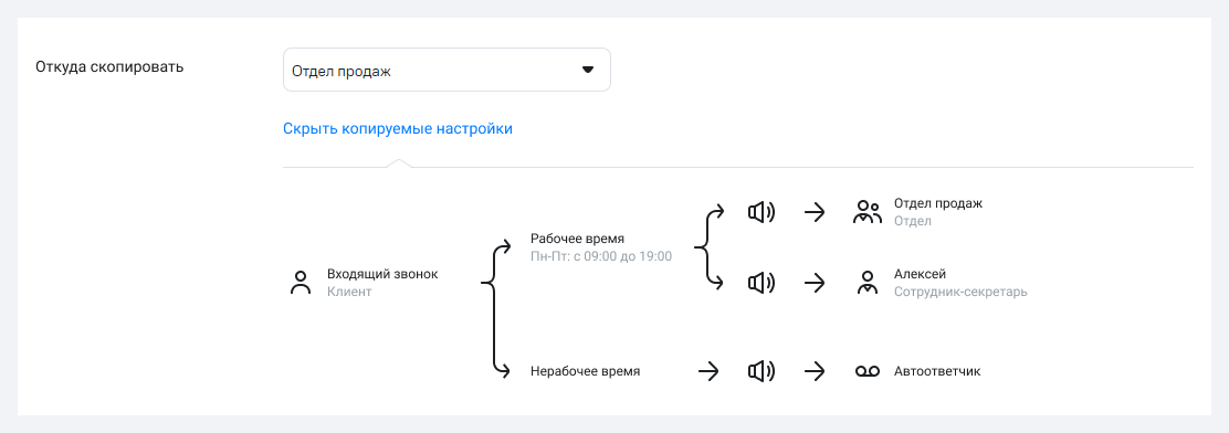 Ниже вы увидите и сможете проверить настройки, которые хотите скопировать на другой номер: схема приема звонков, график работы или настройки приветствия.