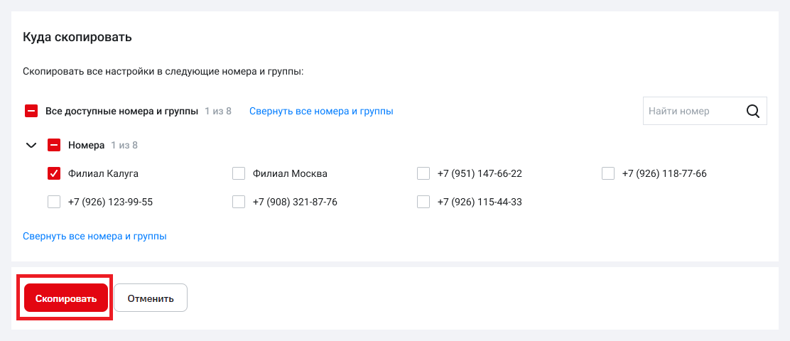 5. Отметьте галочками, куда вы хотите скопировать настройки номера. Вы можете скопировать настройки как на отдельные номера, так и на группы номеров.