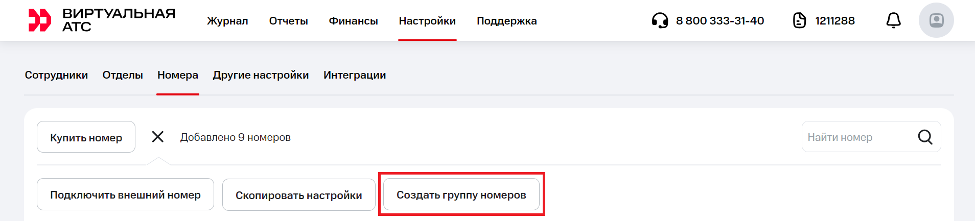 2. В открывшемся меню нажмите на кнопку «Создать группу номеров».