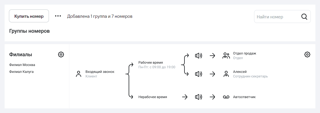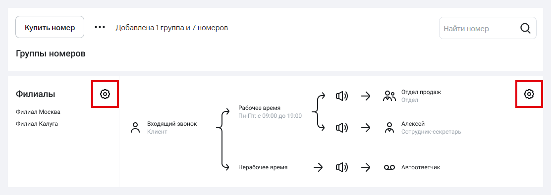 • если вам нужно изменить правила приема звонков, расписание, приветствие в группе номеров – нажмите на шестеренку справа от схемы приема звонков.