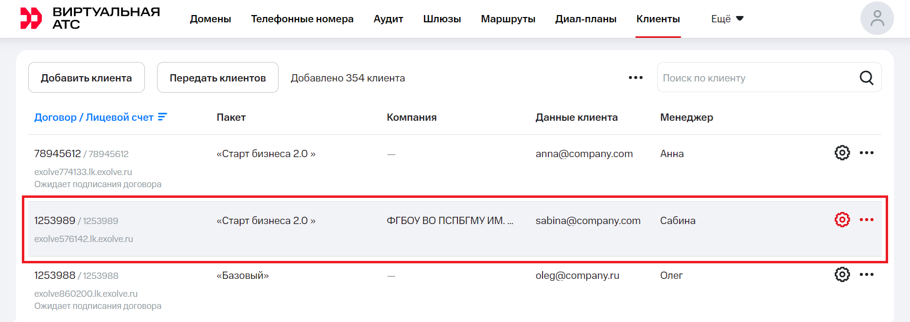 1. Перейдите в раздел «Клиенты». Выберите того клиента, кому хотите предложить кастомную цену. Для этого либо кликните на нужную строчку таблицы, либо введите номер договора или лицевого счета в строке «Поиск по клиенту» и потом кликните по строчке.