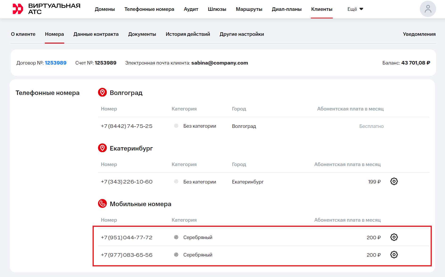 13. В то же время в личном кабинете менеджера в карточке клиента отразится, какие номера купил клиент, в какую они входят категорию и какую абонентскую плату клиент будет вносить за них в месяц.