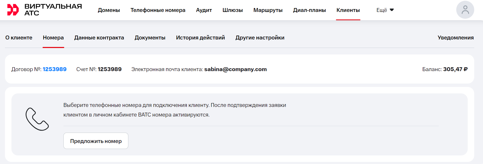2. Автоматически вы окажетесь на вкладке «О клиенте», где размещена общая информация о нем. Перейдите на соседнюю вкладку «Номера и, чтобы выбрать номера для подключения клиенту, нажмите кнопку «Предложить номер».