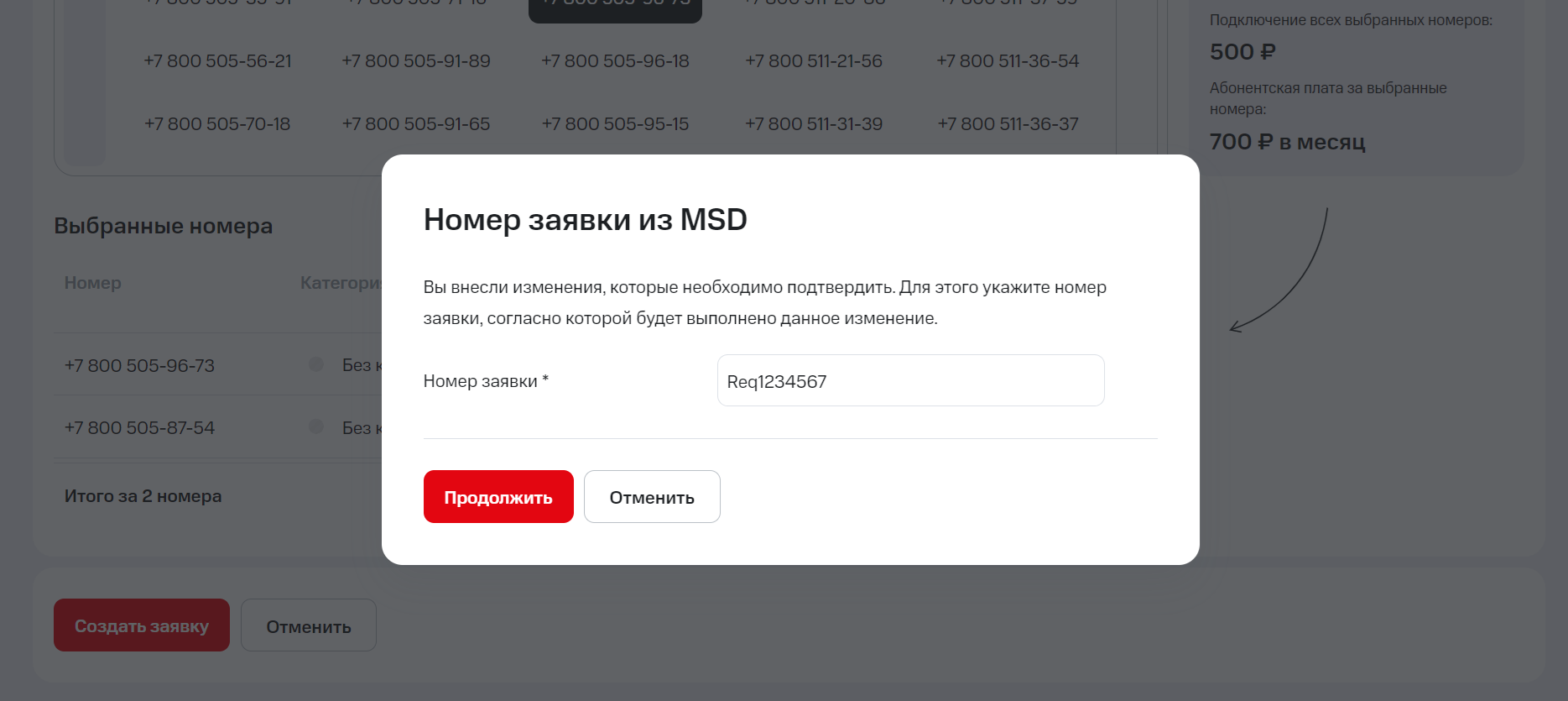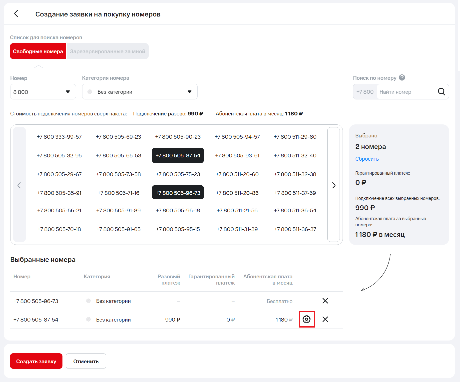 3. При создании заявки на покупку номеров выберите номер (8 800, 8 804, мобильный, городской), категорию номера и в списках свободных номеров выделите те, которые хотите предложить клиенту.