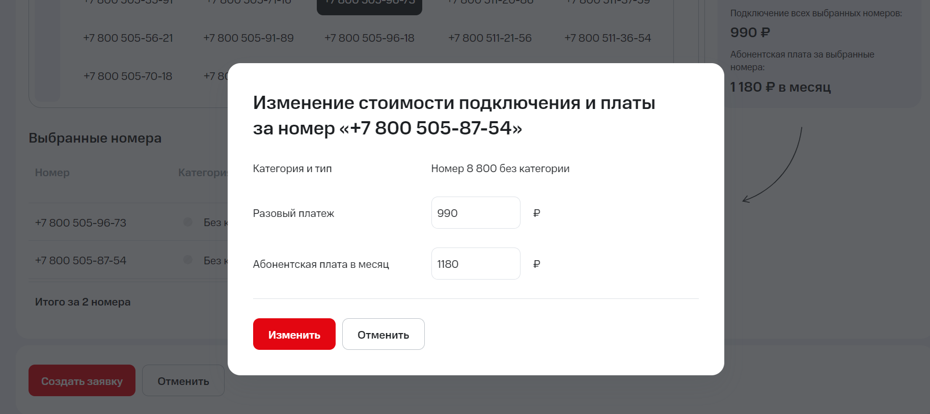 4. Внесите изменения по ценам. Вы можете скорректировать стоимость разового и гарантированного платежа, а также абонентскую плату в месяц. После этого нажмите «Изменить».