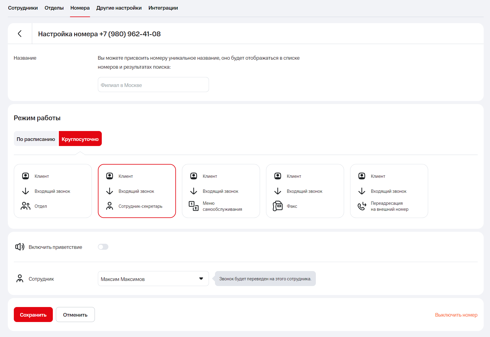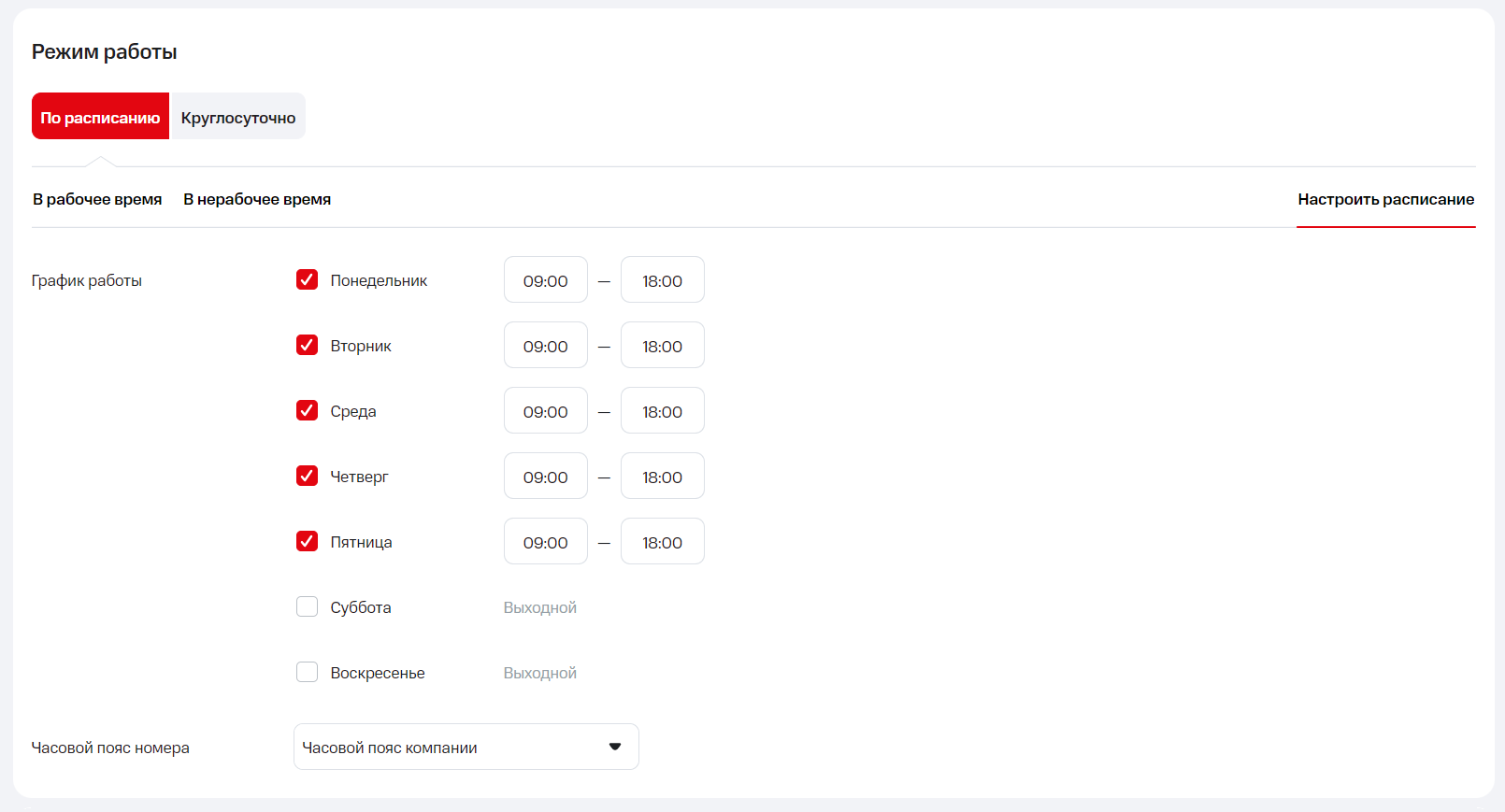 Номер может работать круглосуточно или по расписанию. Мы рекомендуем установить «По расписанию», чтобы в нерабочее время ваши клиенты слышали информацию о том, что сотрудники ответить не могут, и оставляли вам голосовую почту. Чтобы установить время работы, кликните на «Настроить расписание для номера» и настройте его.