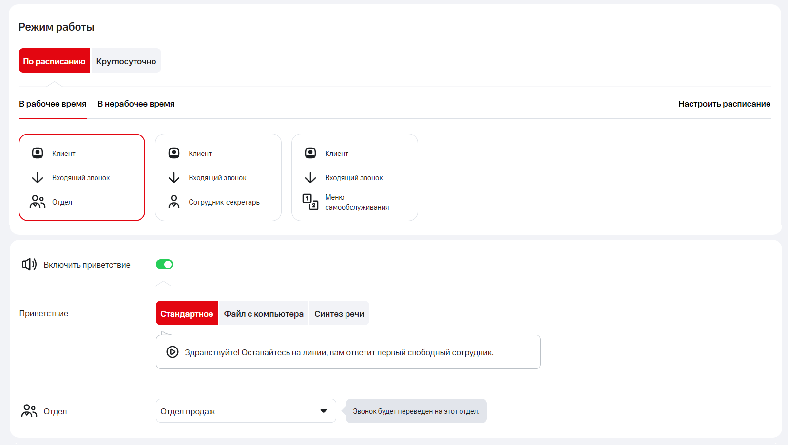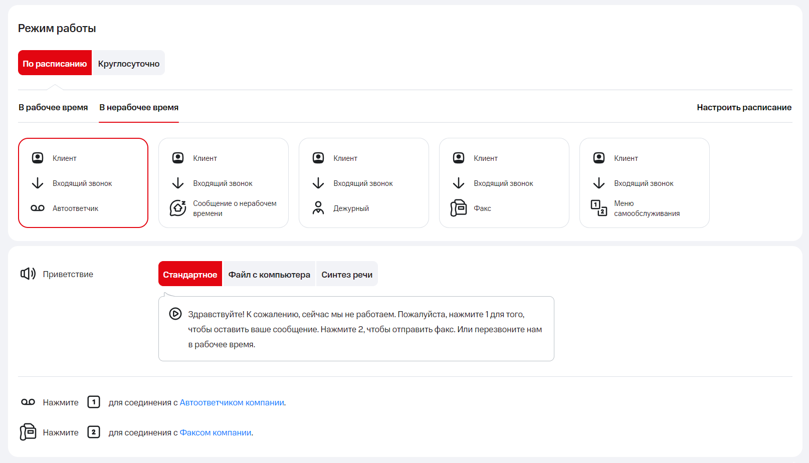 В рабочее время звонок может быть отправлен в отдел, на сотрудника или голосовое меню (IVR). В каждом варианте вы можете использовать стандартное голосовое приветствие, либо загрузить свое.