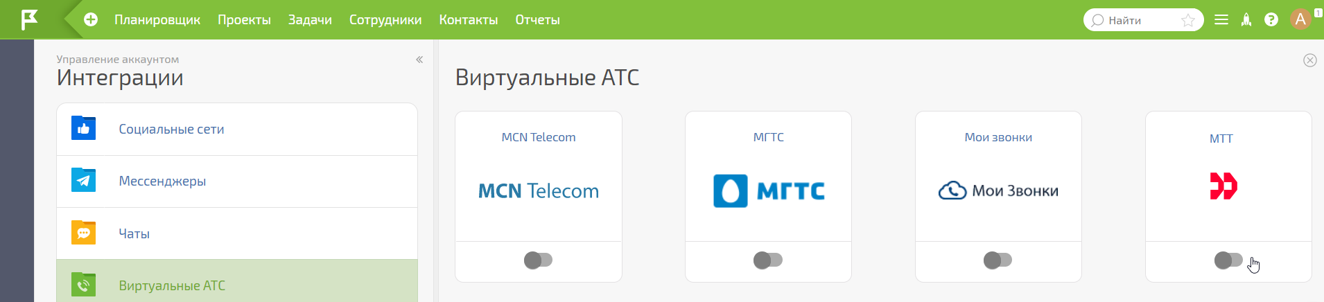 Выберите раздел «Интеграция с другими сервисами» — «Виртуальные АТС».