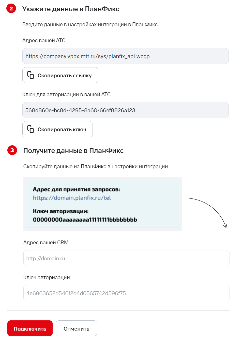 Скопируйте адрес вашей АТС, вставьте его в поле «Адрес АТС» в ПланФикс. То же самое для ключа авторизации: скопируйте его в ПланФикс и вставьте в настройках интеграции.