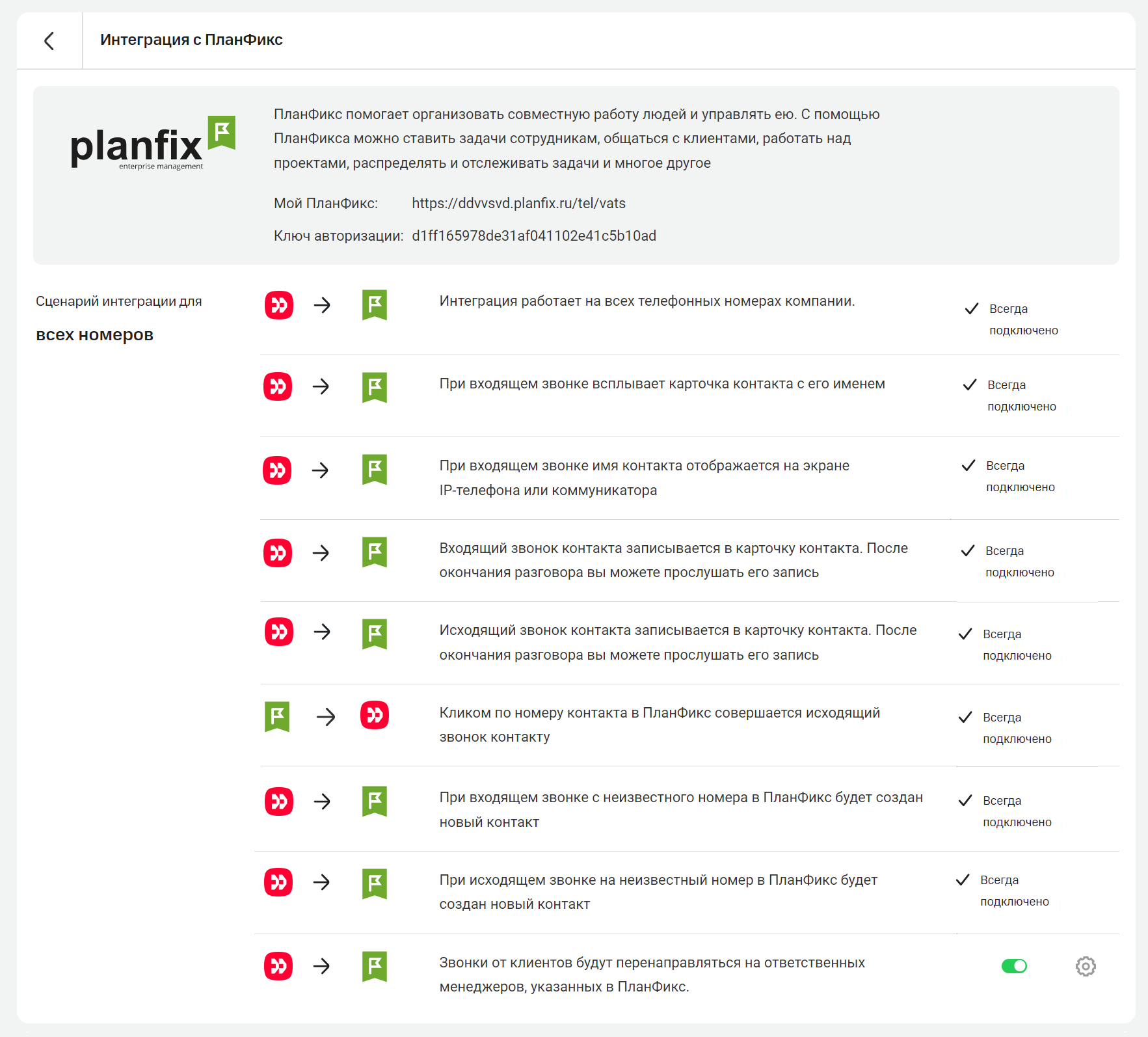 Таким же образом скопируйте адрес для принятия запросов в ПланФикс и вставьте его в поле «Адрес вашей CRM» То же самое проделайте и для ключа авторизации — скопируйте его в ПланФикс и вставьте в настройки интеграции в вашей АТС.